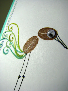 This set is simply awesome! So may possibilities! I could not resist to use the little coffee bean to make some birds. Added googly eyes to give them some personality and of course legs and beaks. The swirly tails are on the set, too. Lastly I added a strip of PP and cut a panel with a stitched die by Cutplorations. Mounted everything on turquoise card stock and added two enamel dots.